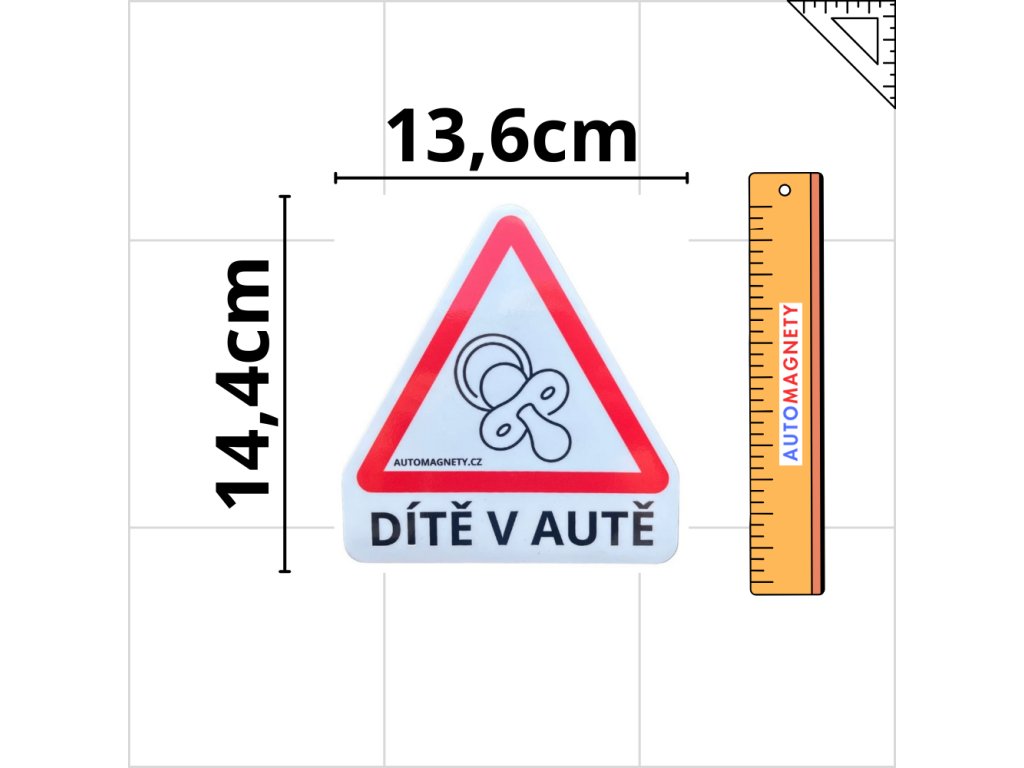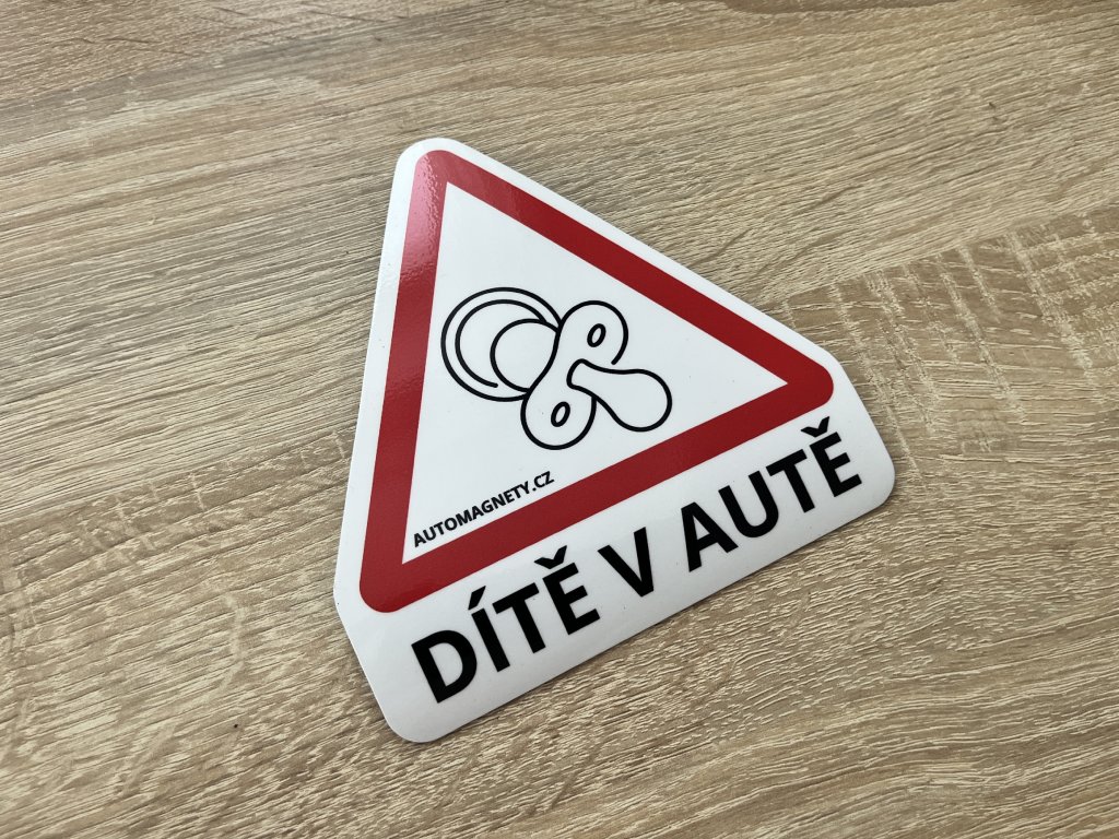 Trojúhelníkový tvar s červeným ohraničením a symbol dudlíku zajišťuje okamžité rozpoznání. Jasný nápis „DÍTĚ V AUTĚ“ je čitelný i v rychlém provozu a za šera.
