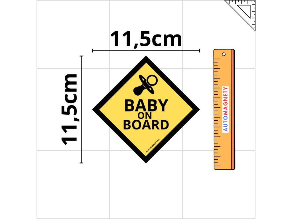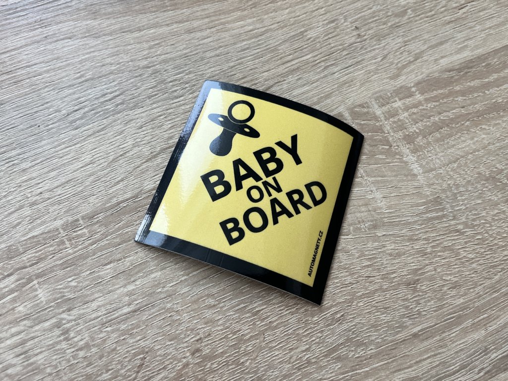 Žluté pozadí s černým potiskem, čtvercový tvar otočený na špičku a symbol dudlíku zajišťují, že nápis „BABY ON BOARD“ je čitelný i v hustém provozu nebo při jízdě v zahraničí.